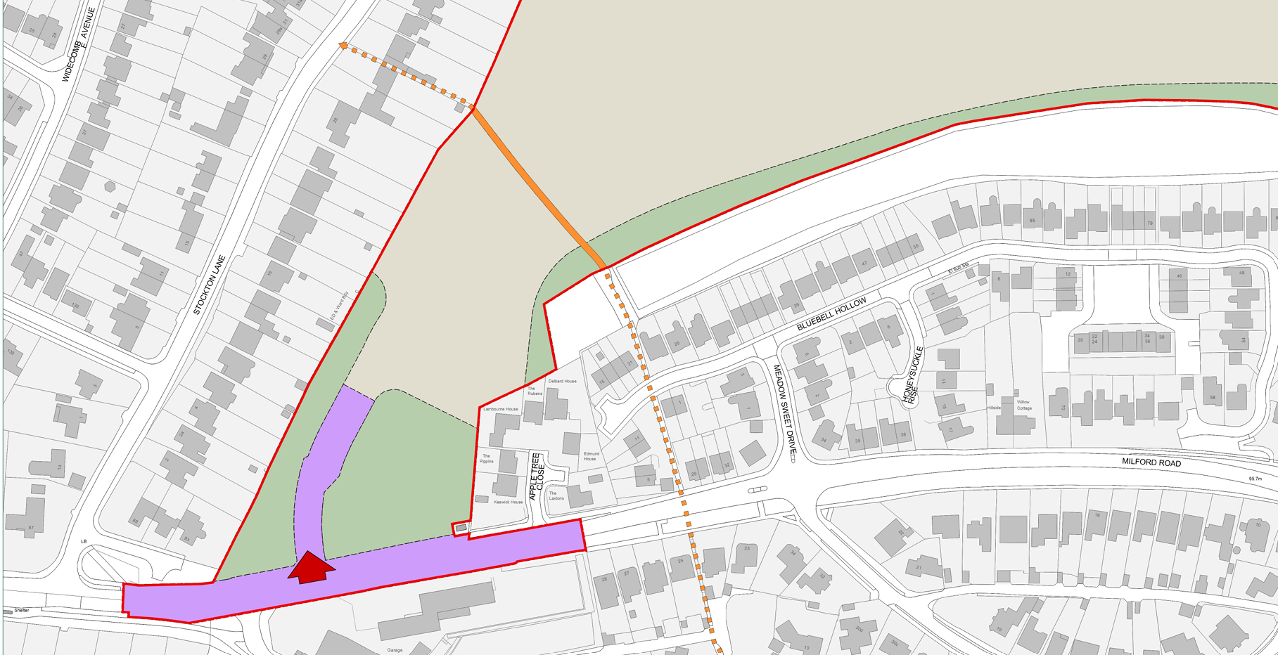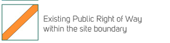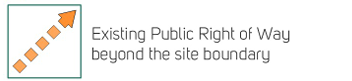 There is an existing Public Right of Way (PRoW) footpath that crosses the south-western corner of the field and provides pedestrian access to Weeping Cross. The section of this outside our red line is shown as an orange dotted line, whilst the section within our red line (which will be retained) is shown as a solid orange line.